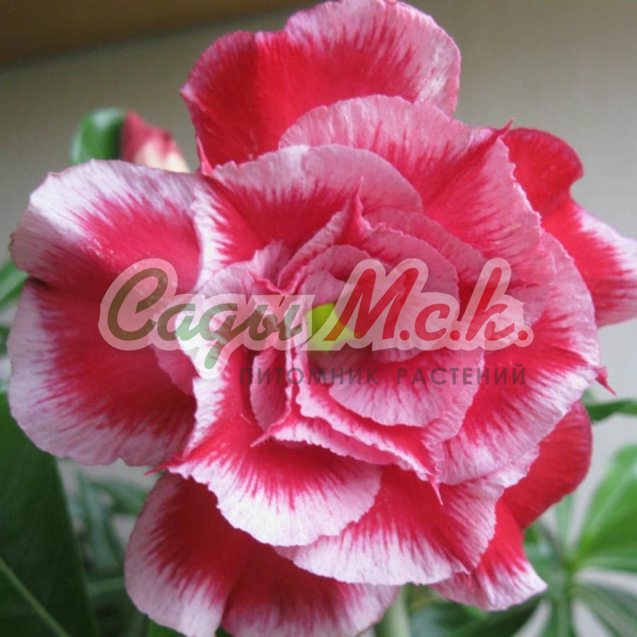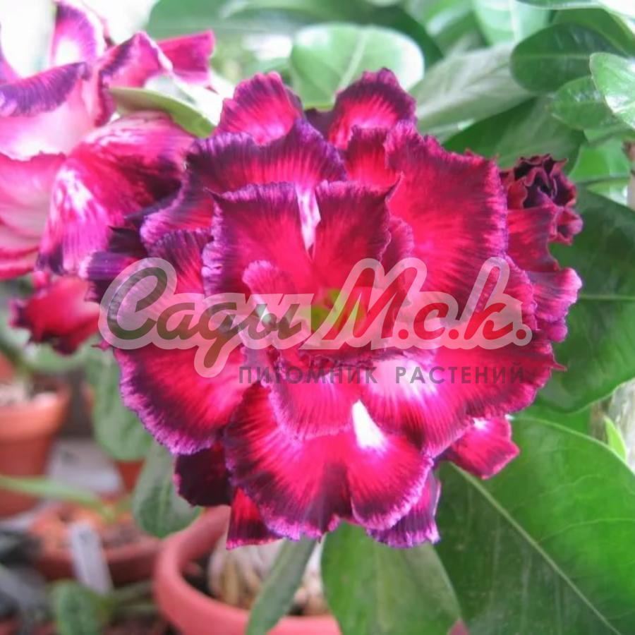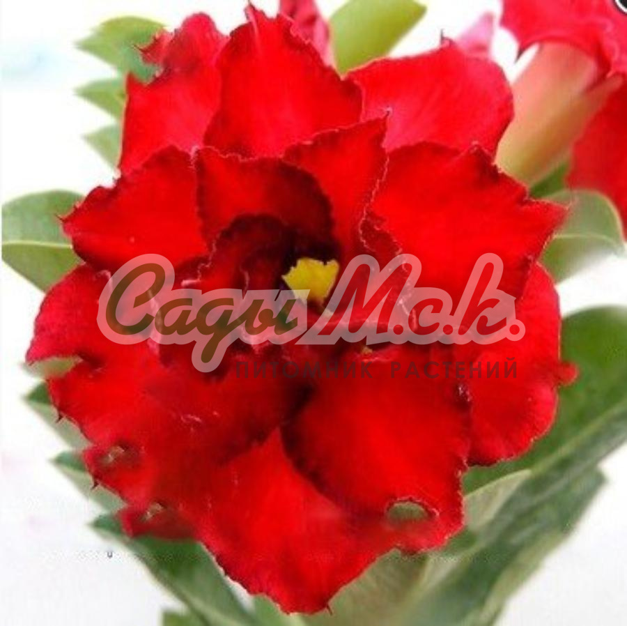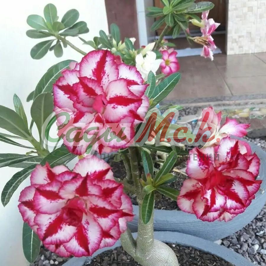 Adenium Double Color - красивый кустарник с мясистым стволом. Листья огромные, глянцевые, темно-зеленые с салатовой полосой. Цветки немахровые, крупные с желтым основанием. Лепестки красные с темно-бордовыми краями.