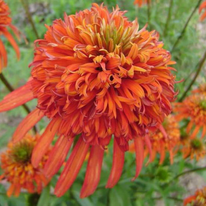 Эхинацея пурпурная Саммер Сальса (Summer Salsa), поселившись в вашем саду, подарит цветнику длительное и яркое цветение. На цветоносах, высотой 90 сантиметров, с июня по сентябрь раскрываются крупные густомахровые соцветия. Их цвет насыщенный, оранжевый, с жёлтыми всполохами. Лепестки имеют зубчатые кончики и слегка завиваются, отчего эффект махровости только усиливается. На ярком солнце окраска бутонов не выгорает. В букете Эхинацея пурпурная Саммер Сальса сохраняет свежесть более недели. Эхинацея очень неприхотлива, она требует от садовода лишь полива в жару и удаления отцветших бутонов.