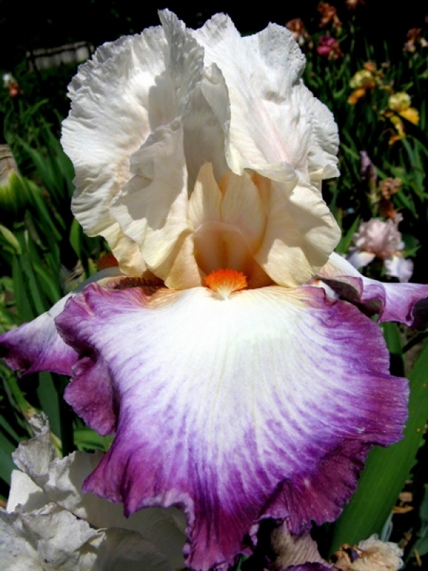 Фантастический сорт бородатого ириса с огромными цветками, На белых стандартах заметны светло персиково-желтые прожилки а на широких белых фолах красуется ярко мандариновая бородка и выразительная малиново-пурпурная кайма Этот сорт прекрасно растет и размножается, поражая обильным цветением На прочном цветоносе может быть 4-5 одновременно открытых цветка.