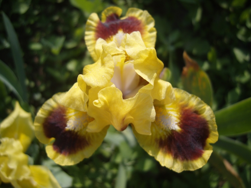 Рассада ириса Jazzamatazz представляет оригинальный сорт среди стандартных карликовых ирисов, имеющий контрастную расцветку в желто-коричневой гамме. Стандарты (верхние доли) - кремово-желтые, лимонные с небольшими включениями рубинового цвета у самого основания. Фолы (нижние доли) сочетают в себе кремово-желтую кромку и насыщенно-рубиновую, почти шоколадную основу в виде четко очерченного пятна. Лепестки гофрированные. Бородка у цветка золотисто-белая, располагается она над наиболее светлым участком фола. Такой резкий контраст сразу привлекает внимание