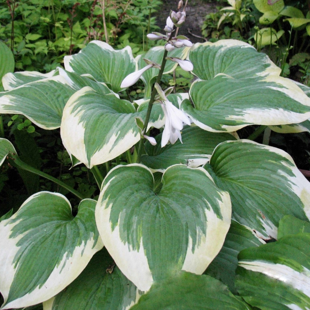 Хоста гибридная Роберт Фрост обладает необычной окраской: края рельефных зеленых листьев, оттенок которых варьируется от сизо-синего до серого, окрашены широкими кремово-белыми штрихами, создающими рваную окантовку. Эффектный сорт гармонично смотрится в смешанных посадках, подходит для городского озеленения и украшения водоемов.