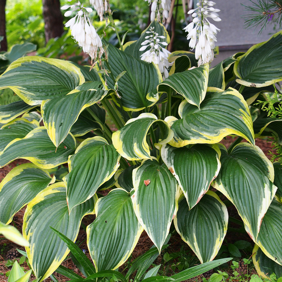 Саженцы хосты Уеllоw Rivеr отличаются выносливостью и устойчивостью к заболеваниям. Главным отличием данного сорта являются большие волнистые листья темно-зеленого цвета с желтой каймой. Они образуют высокий куст (до 80 см) вазообразной формы. С апреля по сентябрь его украшают белые цветки. Хоста Уеllоw Rivеr хорошо растет, как в легкой тени, так и на солнце. Она также отличается зимостойкостью и устойчива к вредителям (слизняки, улитки и пр.) В ландшафте названный сорт хосты чаще всего используют как растение заднего плана.