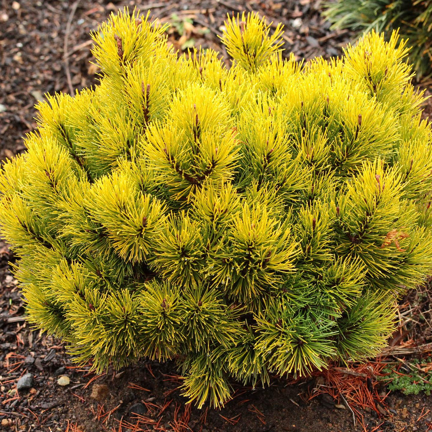 Сосна горная Офир – это еще одно хвойное карликовое растение, которое элегантно меняет летний окрас ярко-зеленой хвои на лимонный осенью и золотисто-желтый зимой. Этот медленнорастущий плотный шарик с сюрпризом вырастает в 20-летнем возрасте всего лишь до 0,8м в высоту и 1м в диаметре. В более зрелом возрасте шарик трансформируется в широкий конус или кеглю. Форма этой малютки часто бывает причудливой, что не портит ее, а лишь придает пикантности. Жесткая, колючая, короткая, прямая хвоя собрана в пучки по две хвоинки, бывает размером не более 3см.